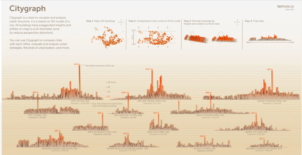 In order to teeter that line of pros and cons with technology you have to be able to boil the whole process down and just make a good chart. A good chart, which is described in the book “Knowledge is Beautiful” starts with a good balance of the information that is being presented, the story that is being told through the use of the information, the goal of the graphic, so that is actually has a proper function and isn’t just there to look pretty and finally the visual form that the data and the story takes. An example of a good chart to me is from informationisbeautifulawards.com and the graphic that I found the most pleasing to look at and to understand was the “Citygraph”. It had the perfect balance of all 4 and didn’t try to get too complicated. The information was all the different cities and the different sizes of their urban structure and in the final graphic it is easy to see all the different sizes and use the visual form they chose to easily compare the different cities to one another.