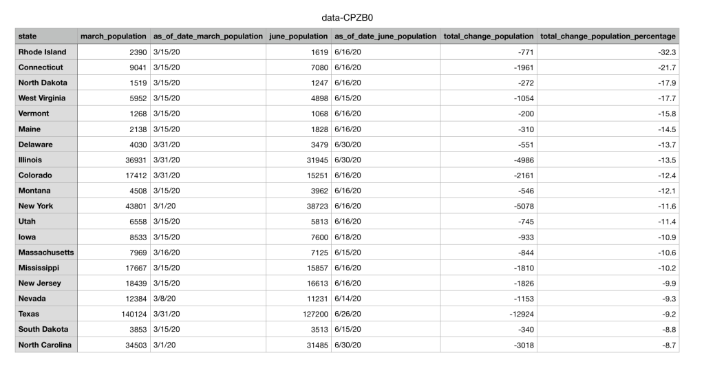 The second set of data I found was from a public source called NJ.com. It is a trusted website where many local journalists and researches go to find data collections and articles about issues in New Jersey. I chose to look at the data surrounding prisons during the pandemic. The dataset shows that population numbers in prisons across multiple states are going down due to the pandemic.