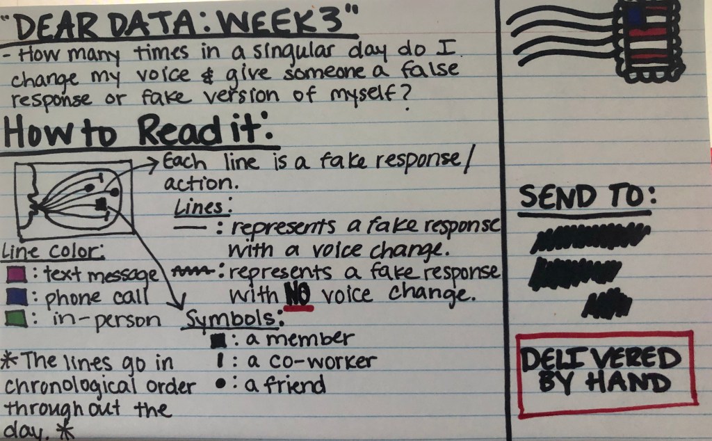Overall this Dear Data was definitely the most interesting. It took a lot to constantly remember to mark down a fake response through out the entire day and I’m sure I missed a bunch, but it was fun to see just how fake I am through out my day at work. It also makes me wonder what it would be like if I just used my deeper natural voice and said everything that I wish I could say to people.