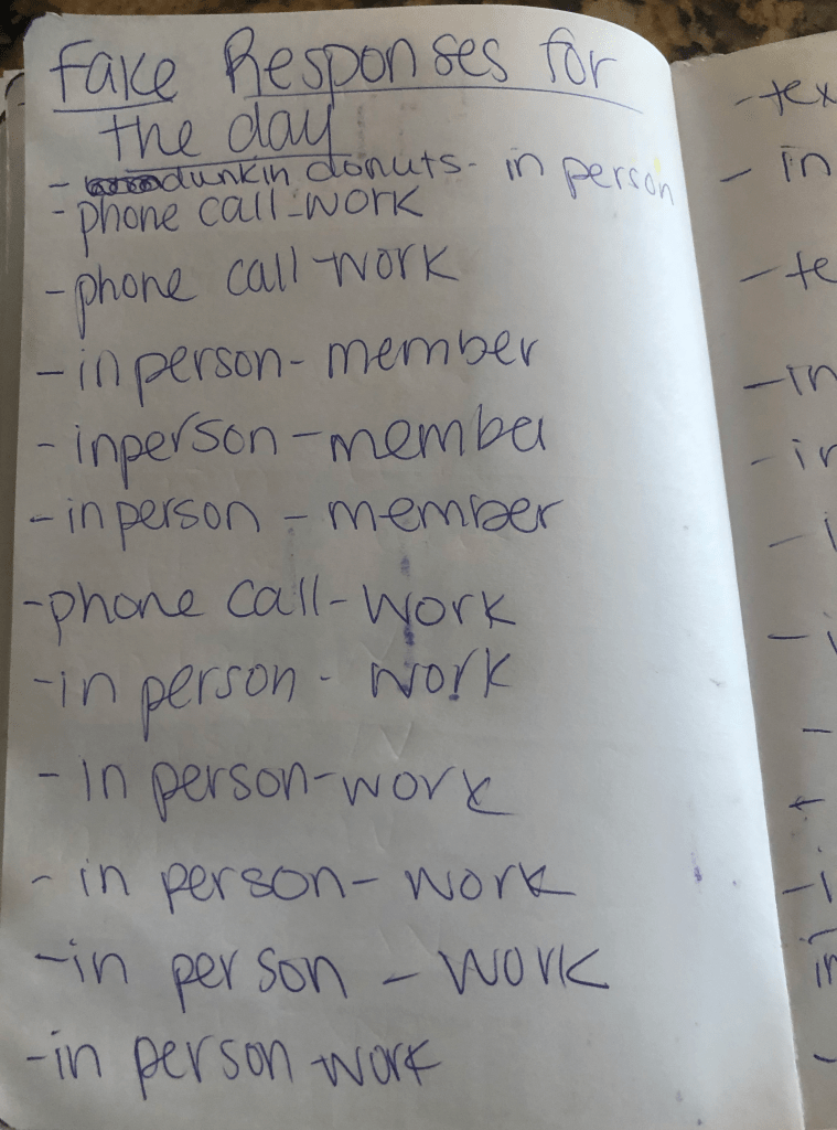 The day starts great I don’t speak in the morning when I get ready for work so there was nothing to mark down until about 8:30am. My first fake response of the day is also my only data mark that doesn’t have symbol attached to it and that’s because it was me talking to the man at the cash register at Dunkin. Then I got to work and a long day of fake responses started.