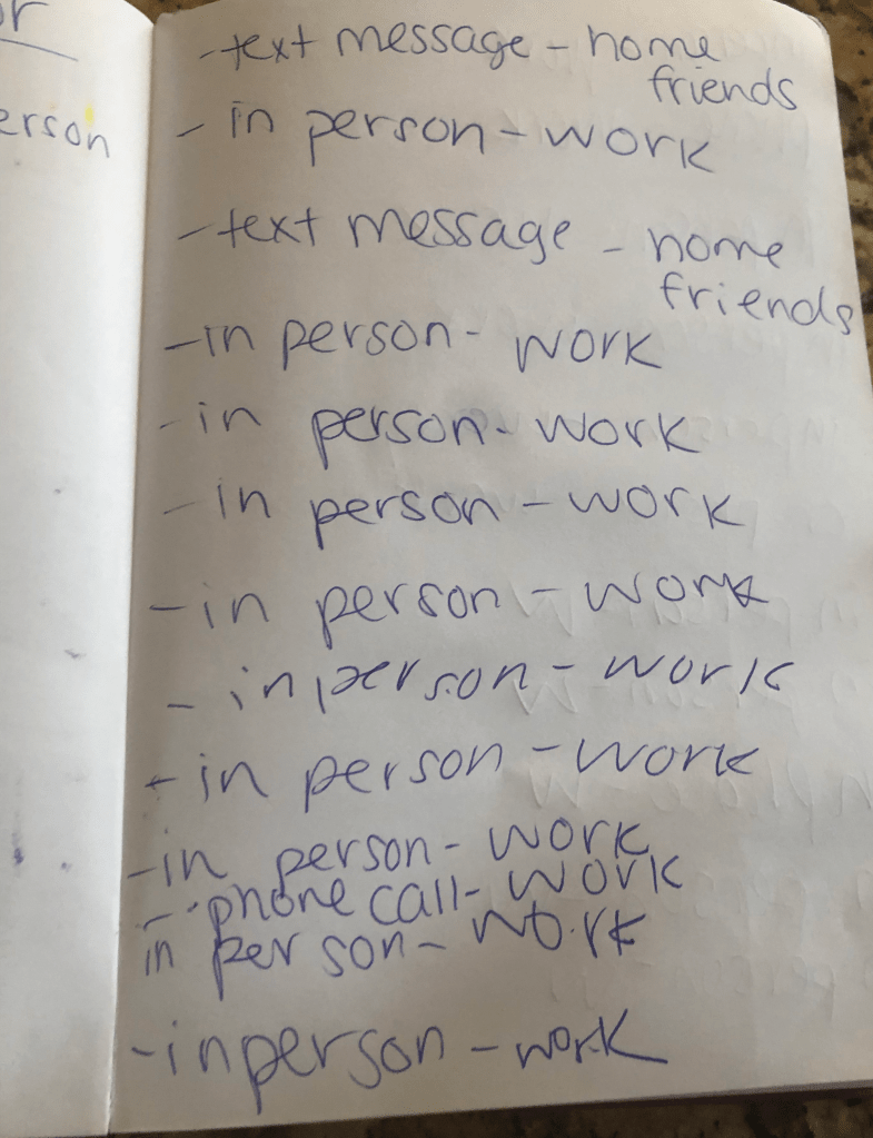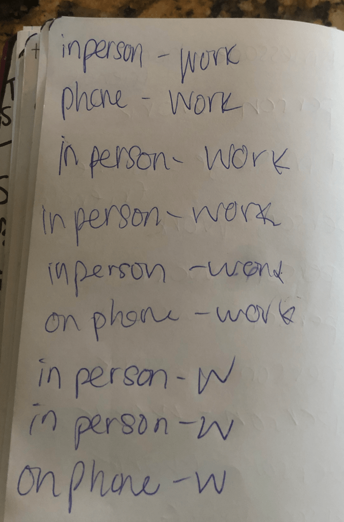 For my final Dear Data I chose to track an entire days worth of my fake responses. Through out my life my friends and family have always called me out for using a very fake voice when I’m talking to people I don’t know and professionals who are usually older than me. So I chose a day this past week where I worked at the beach club in the office. This means I was helping members all day and answering phones. So A LOT of fake responses.