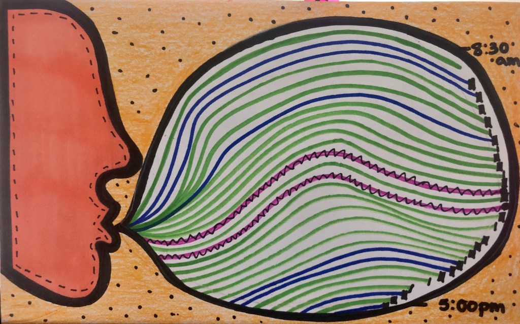 Then the final dear data was only for one day, yet at the same time it was the hardest topic to keep track of collected data points. The question I had asked was such an introspective question about me being a fake person, that between actually doing my job and talking to people I had to have missed plenty of data points. Of course after the day was over the biggest thing I had learned was that I probably should have done a better job at who I was being fake to. This way my graphic could have had even further detail and better symbols.