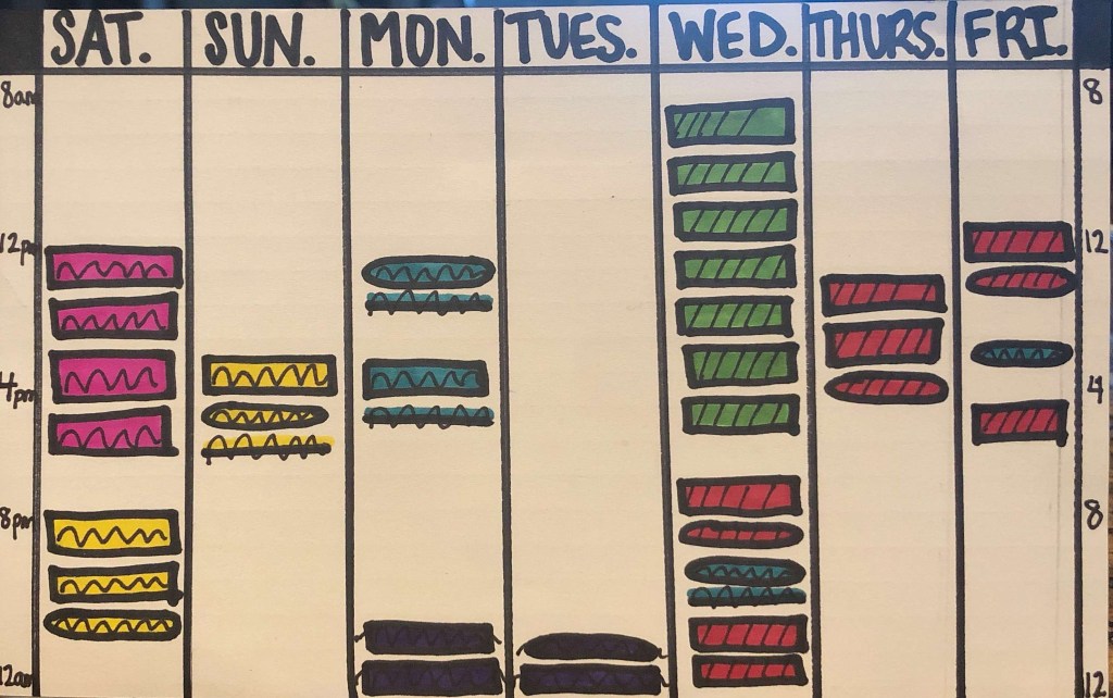 For the second dear data I collected data for an entire week but instead of just multiple tally marks like I did for the first and third ones this one was groups of time. The biggest thing I learned from this one was that I had to come up with a specific way to chart the data points and I ended up landing on breaking each group into full hours, 30 minutes and 15 minute increments. This way the data was easily readable and more spread out across the notecard.
