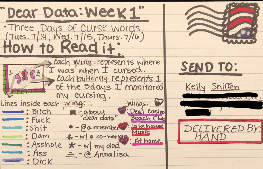 Another difference in data charting is the choice between either using a software to help you chart data, like Datawrapper or you can visualize and design it yourself. Personally I find for complex charts that have multiple columns and layers that Datawrapper is the way to go. It spaces things out evenly and creates the simplest and easiest to read chart. On the other hand, I love to have creativity when it comes to anything and Datawrapper limits you a lot with how far you can design a chart. Making your own chart means all the decisions are yours. Especially with the Dear Data projects, figuring out the artwork for the front of the postcard was always my favorite part, but at times that led to the chart looking messy and confusing.