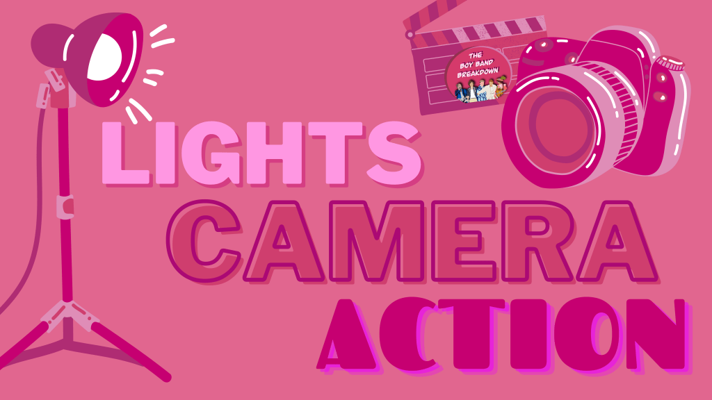 The first issue was space. Most rooms in my house are filled with furniture that can’t really be moved, so the only available room to use was my sister’s since she has the most room and the least furniture. I then had to style a fold up table to look like a cute desk, then I dragged my desk chair over to her room and put up an old boy band poster I had and put the shows logo into a frame and thought great I’m all ready to go. So I set uo the camera and mic, and used my sister’s LED lights natural window light to make sure there were no ugly shadows, but when I looked through the view finder on the camera it still looked blank. So I got to searching for things and in the deepest darkest part of my closet I found all of my sister and mine old boy band merchandise. I took my bed side table shelf, propped it up on two storage boxes and decorated it took look nice. Added a couple more pieces to the desk and was content.