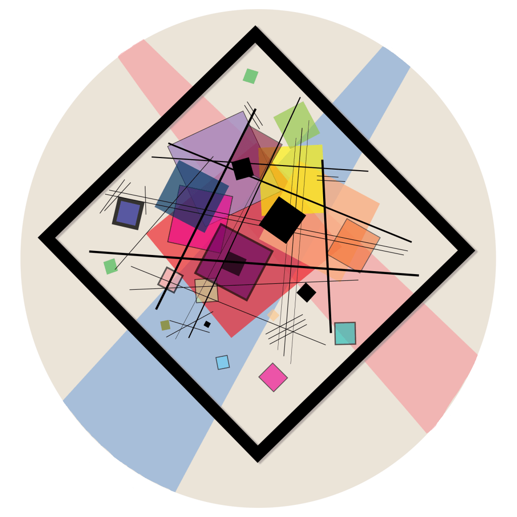 Then I thought about Programming Design Systems’s Article about Basic Shapes and Relationships and how a rectangular/square canvas has no sense of direction in just points you to the middle, but if you rotate the square slightly all of a sudden it takes on a more fun and playful look. So I decided to run with the playful abstract look and went with squares. But I also thought about Kandinsky’s deliberate choice to put all the circles on a square canvas which makes the circles feel smaller and lighter. “The circle is smooth, and appears smaller than the rectangle, even though they have equal dimensions.” (Programming Design Systems)