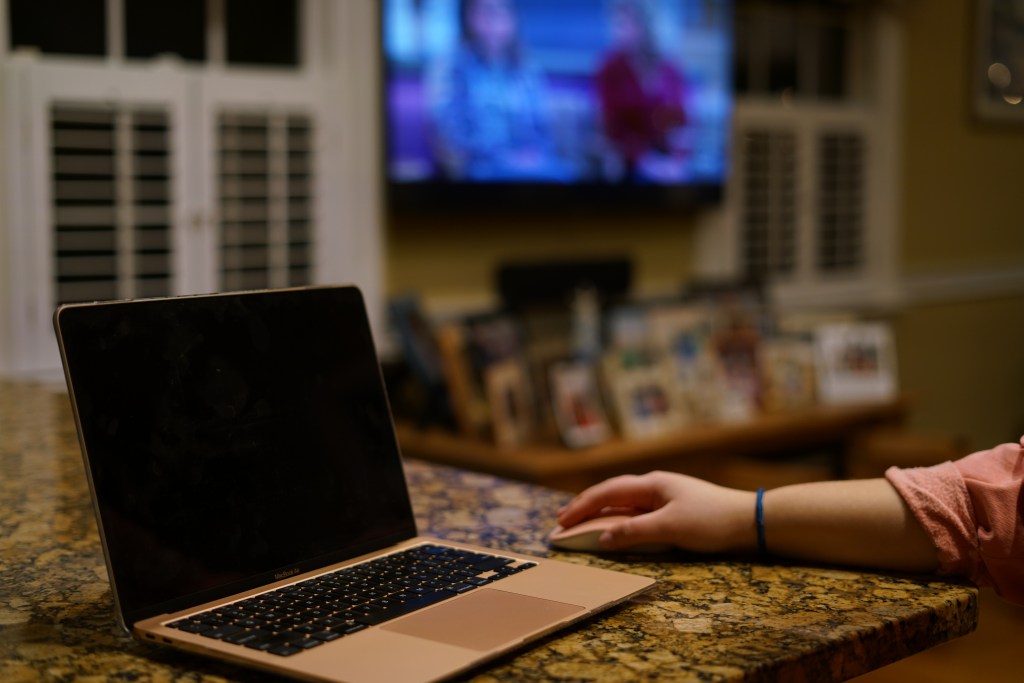 Layering and the different plains/grounds in the picture are used to create a sense of 3D space in a 2D photo. In this photo the foreground is the largest and clearest part of the picture. The foreground itself also uses a titled plane to help the viewer “understand the longer side of the plane (the computer) to be closer in space and perceives the plane as receding. This titled place helps lead you into the middle ground and foreground which overlap and are slightly blurred to show that they are farther away from the center focus. By the time you get to the background it’s completely blurred out to suggest that all the other elements are very far away from it.