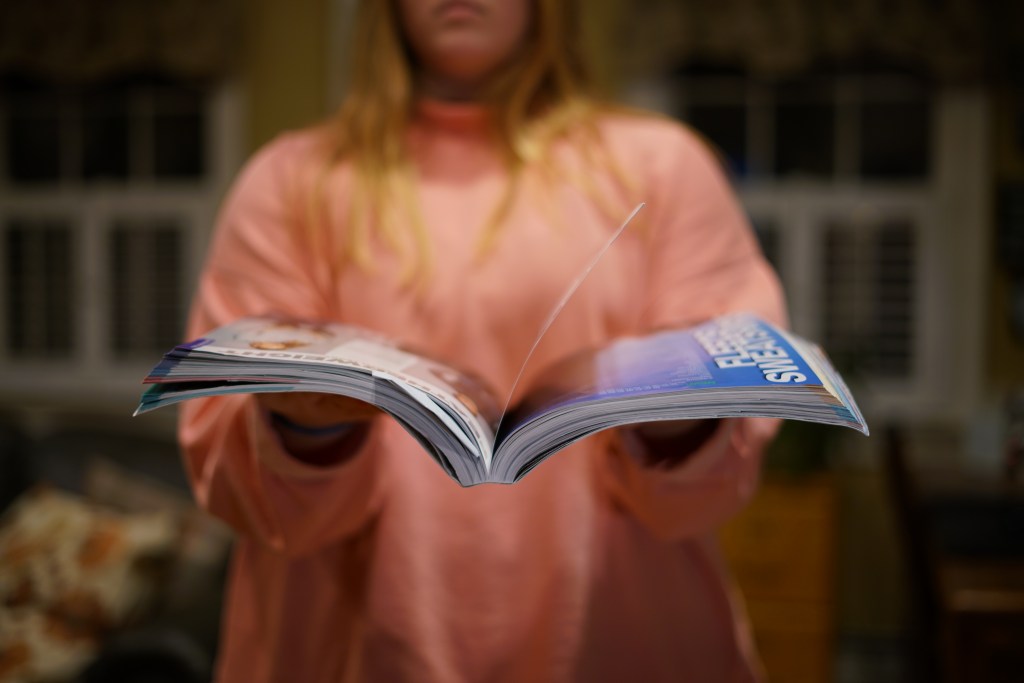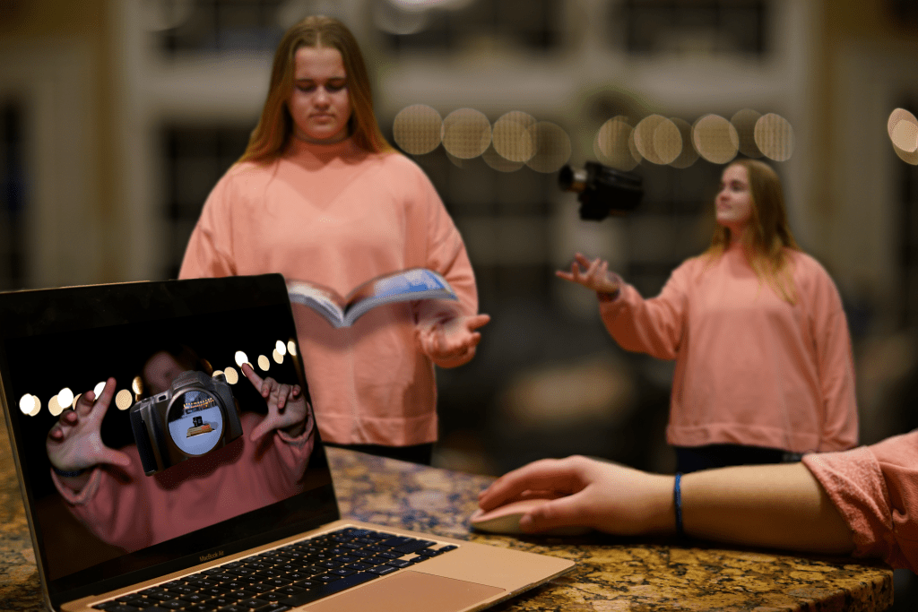 The final fundamental I kept in mind when designing this project was the illusion of volume. All the objects photographed were 3D object so that had shadows and highlights which helps to further allude to a #D space. “a progressive shift in tone or value, form dark to light or light to dark, can contribute to the illusion of spacial depth or motion” (Landa). In this photo the main source of lighting is coming from above ceiling lights, so it’s top lit. This met when composition other elements on top of the model I had to consider where I had to add artificial shadows in order to make layering believable and give the object the correct atmospheric perspective. If you look specifically at the textbook in the photo and the camera on the computer screen you’ll see the shadows underneath that show its real world affect on the model.