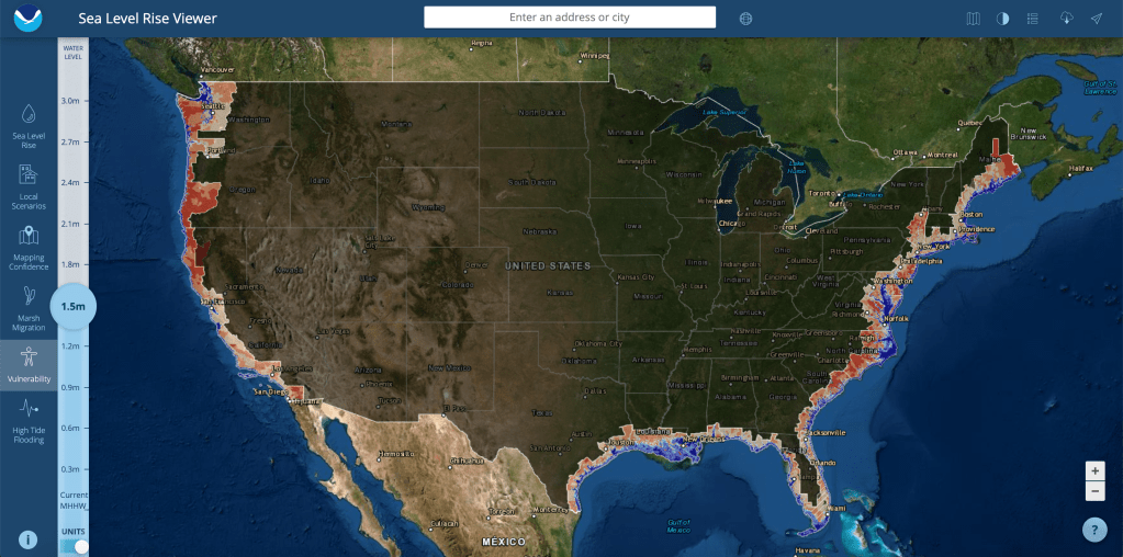 The first graphic is from the Office of Coastal Management and this is a screen grab of their sea level rise viewer and more specifically this map shows exactly what parts of the US are vulnerable as the sea level continues to rise. The Integration and Application Network describes a different practical visual element for scientific communication and one of those of course being maps. “Maps that contain the minimal extraneous information while providing geographical reference points, location insets, scale and orientation information, can be effective. The use of geographical information systems facilitates good map production, but is often insufficient for good communication products without additional editing.” (Dennison) The map clearly shows how many meters worth the ocean would have risen, what cities are where, and the red color is the level of vulnerability, while the blue color indicates that the land is already under water. The visual is a simple but effective depiction of just how much land we can lose across the country to sea level rising.