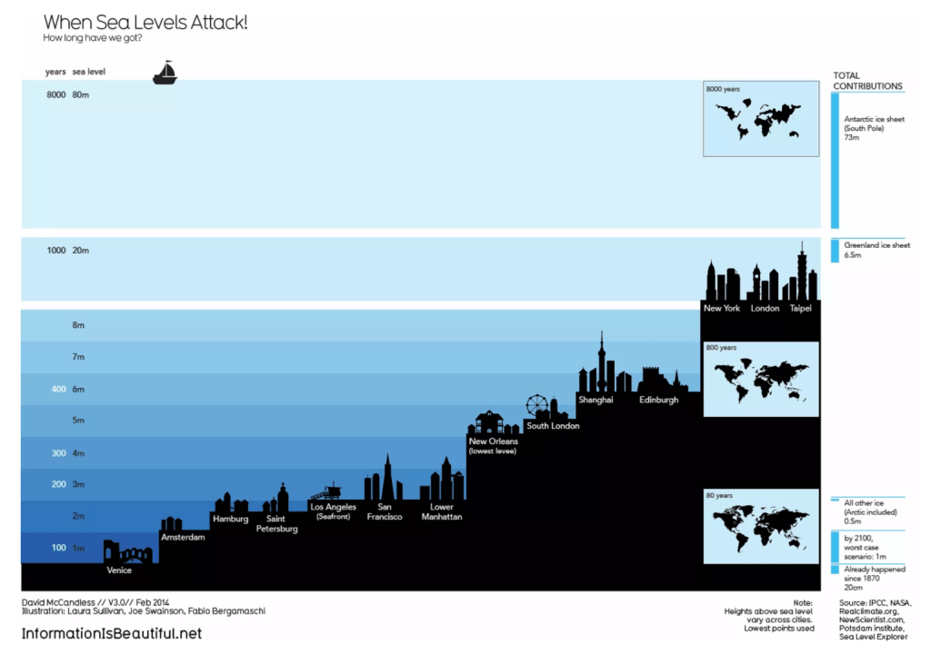 The next image is a graphic depicting just how many years we have before sea levels will engulf all the major cities around the world. It’s a sobering image because some believed cities like Venice and Amsterdam don’t have much projected time. This visual can be defined as a good one if you look at David McCandles’s “What Makes a Good Visualization” chart. It encapsulates good data by showing both the years it will take, the city names, and the meters the ocean will have to rise. It has a great concept and visual form by using a ladder style to show similarities and differences between each city. And it’s function is very clear from the start, the chart is made to show people that rising ocean sea levels isn’t a joke and won’t just raise tides it’s going to destroy cities.