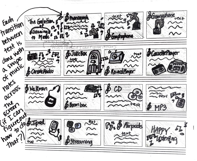 In the second photo you’ll see a storyboard of how I want each part laid out and how I would like to create transitions between each slide. I’ going to start by making all the musical assets in Illustrator and Photoshop and then bring it over to After Effects to animate.