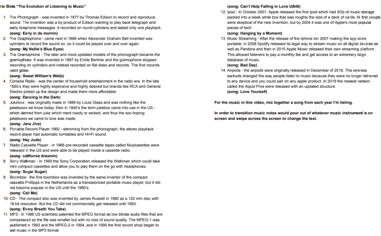 At this point it is about 16 slides long, and since I’m going to have to edit completely on my laptop due to the outstanding circumstances, I may have to shorten the history of listening to music and make it less slides, but I will cross that bridge when I get there. For now this is the plan.
