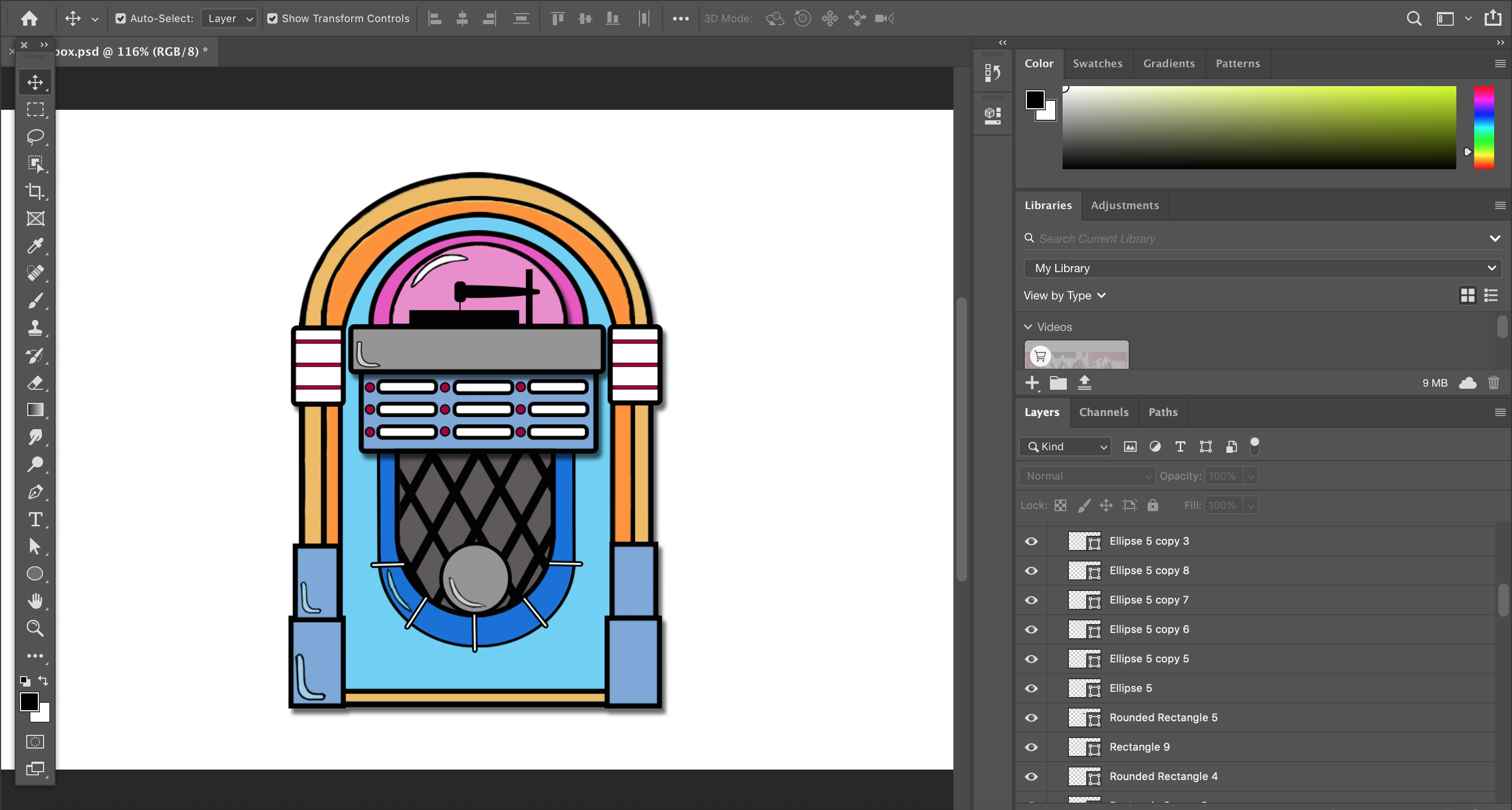 This took quite some time as some of these projects had over 60 layers in order to create the image just right. But using vector images I found for inspiration i was able to make each of them look like cartoon versions of the real things.